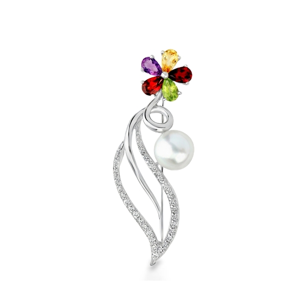 This Sterling Silver Floral Pearl Brooch blends nature-inspired design with timeless sophistication. Featuring a vibrant stone flower and a lustrous center point, this piece serves as an elegant focal point for any ensemble, from professional blazers to evening wraps.