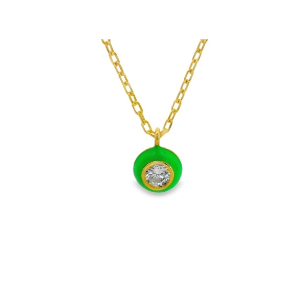 The necklace has a clean and simple design, focusing on the contrast between the gold, the vivid green enamel, and the sparkle of the CZ. The use of enamel and the clean lines give it a contemporary feel. The thin chain and small pendant contribute to a delicate and feminine aesthetic. This necklace could be worn daily, layered with other necklaces, or dressed up for special occasions.