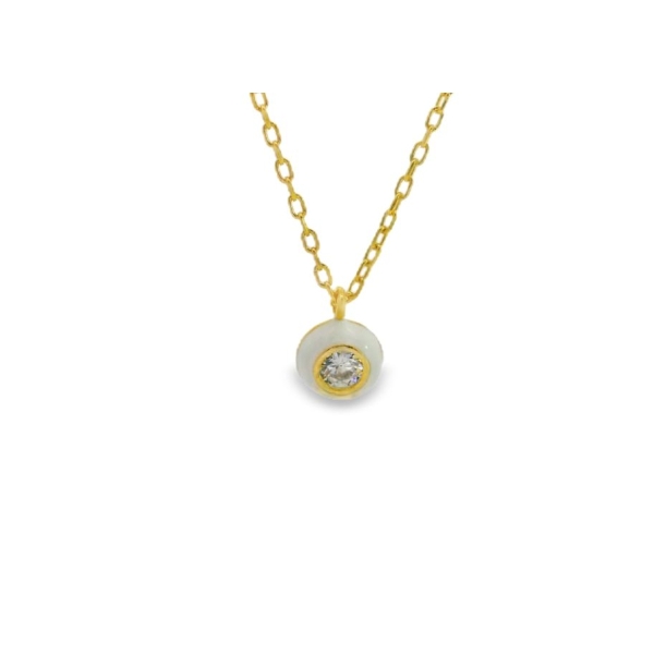 The necklace has a clean and simple design, focusing on the contrast between the gold, the white enamel, and the sparkle of the CZ. The use of enamel and the clean lines give it a contemporary feel. The thin chain and small pendant contribute to a delicate and feminine aesthetic. This necklace could be worn daily, layered with other necklaces, or dressed up for special occasions.