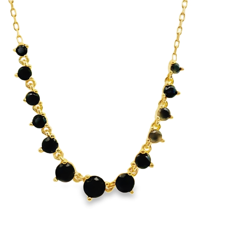 This elegant necklace features striking black stones, each meticulously set in a warm, 925 sterling silver frame with a luxurious yellow gold plating. The contrast between the deep black of the stones and the radiant gold creates a sophisticated and versatile piece. The delicate chain complements the pendant perfectly, making it ideal for both everyday wear and special occasions.