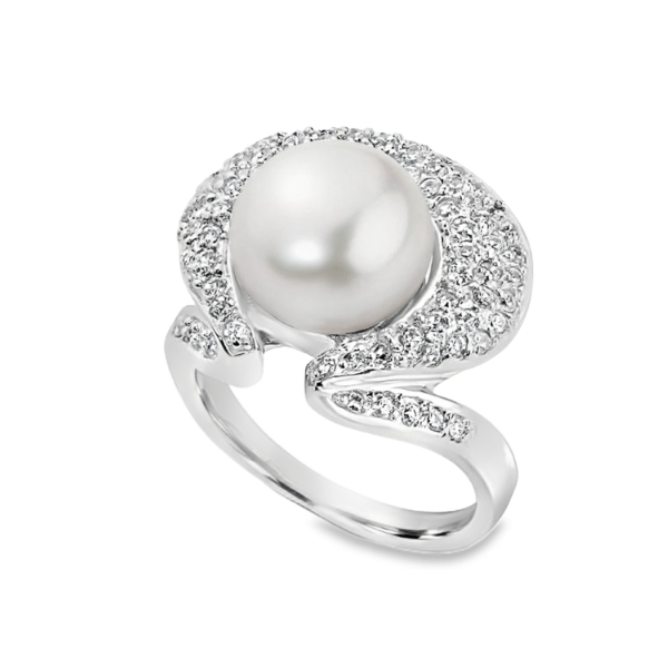 The ring features a large, Natural Fresh Water Pearl nestled securely within the silver embrace. To further elevate the design, a shimmering array of Cubic Zircons pavé-sets the bypass arms, catching the light from every angle and drawing the eye toward the pearl’s soft glow.