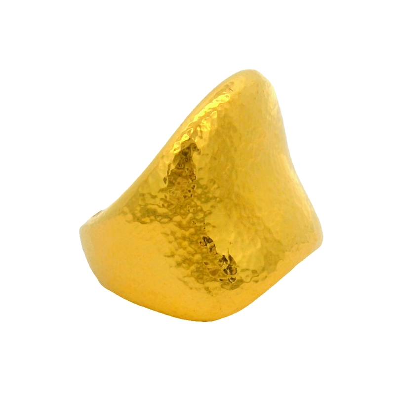 Crafted from sterling silver 925, this bold ring shines with a rich yellow gold plating. Its distinctive crest-like shape and unique hammered finish create a fluid, modern sculpture for your hand. Light dances across its surface, showcasing its rustic, artisanal charm and luxurious golden warmth.