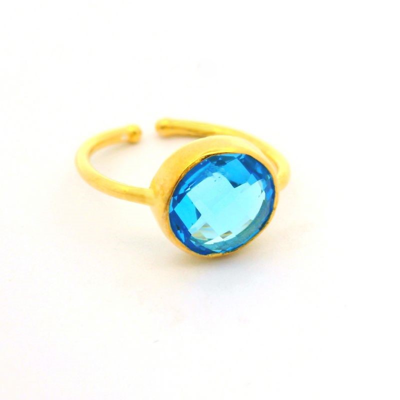 This exquisite piece is perfect for adding a bold and eye-catching statement to your jewelry collection. The vibrant blue color of the central stone adds a pop of color and a touch of glamour to any outfit. The ring is elegantly crafted with yellow gold plating.