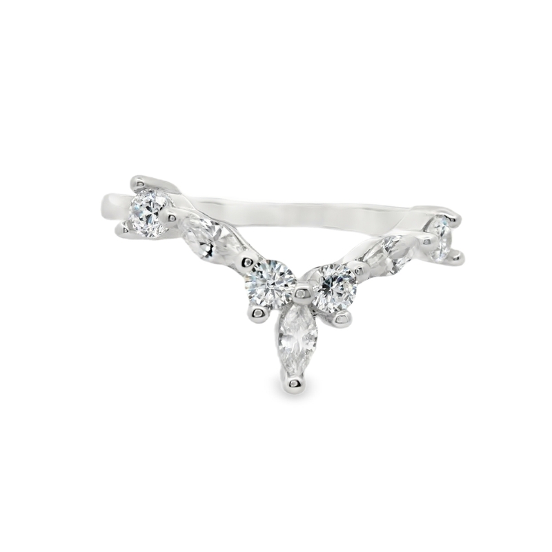 We set this Sterling Silver V Ring with high-quality cubic zircons. These stones catch the light and sparkle from every angle. The design combines round and marquise-shaped stones for a striking focal point. This piece works perfectly as a bold statement or a wedding band enhancer. It brings a touch of luxury to your everyday style. You can view more styles in our silver jewelry collection.