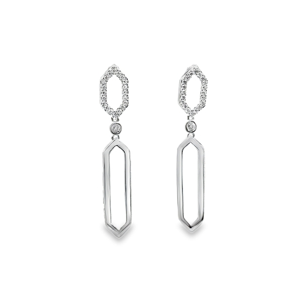 These striking drop earrings perfectly blend modern design with classic sparkle. Crafted in shimmering 9K white gold, they feature a unique, multi-faceted silhouette ideal for making an elegant statement. The earrings are set with dazzling cubic zirconia (CZ), which provides brilliant, eye-catching shine. Secured with comfortable and reliable post backs, these earrings are the perfect way to add modern luxury to your look.