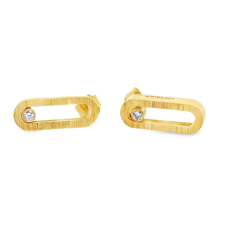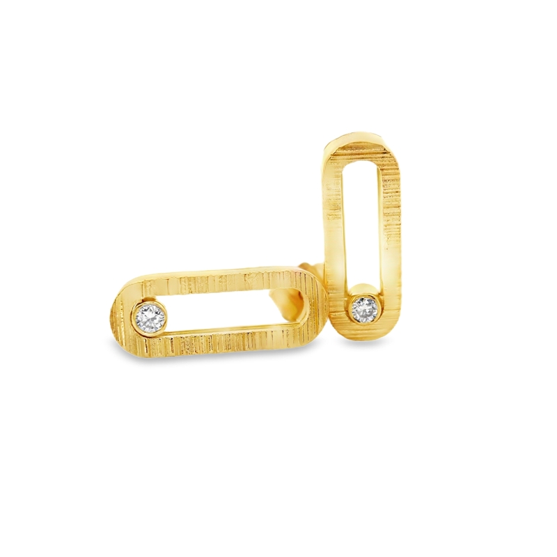 Experience effortless style with these contemporary 18K Gold Diamond Stud Earrings. Crafted in luxurious 18-karat Yellow Gold, the design is inspired by the modern aesthetic of a stylish, textured link. Each earring features a distinctive rectangular open shape with a beautiful, matte textured finish. A single, round brilliant-cut diamond is securely set within the frame, providing a crisp, dazzling focal point. The earrings are designed to sit perfectly on the lobe, offering a sophisticated and chic everyday sparkle.