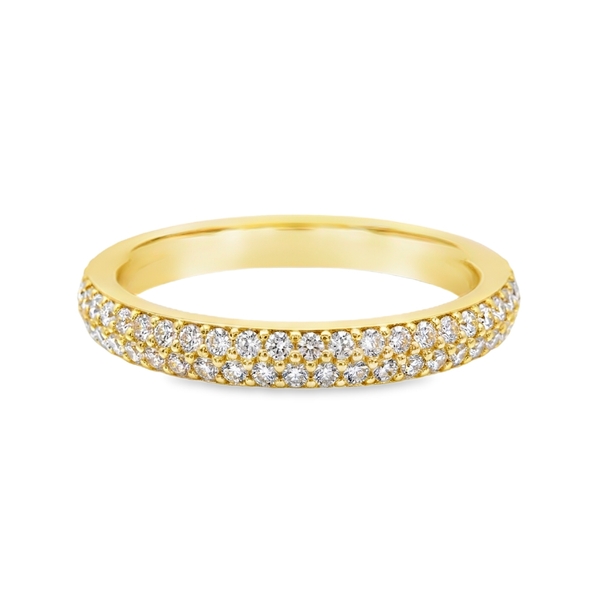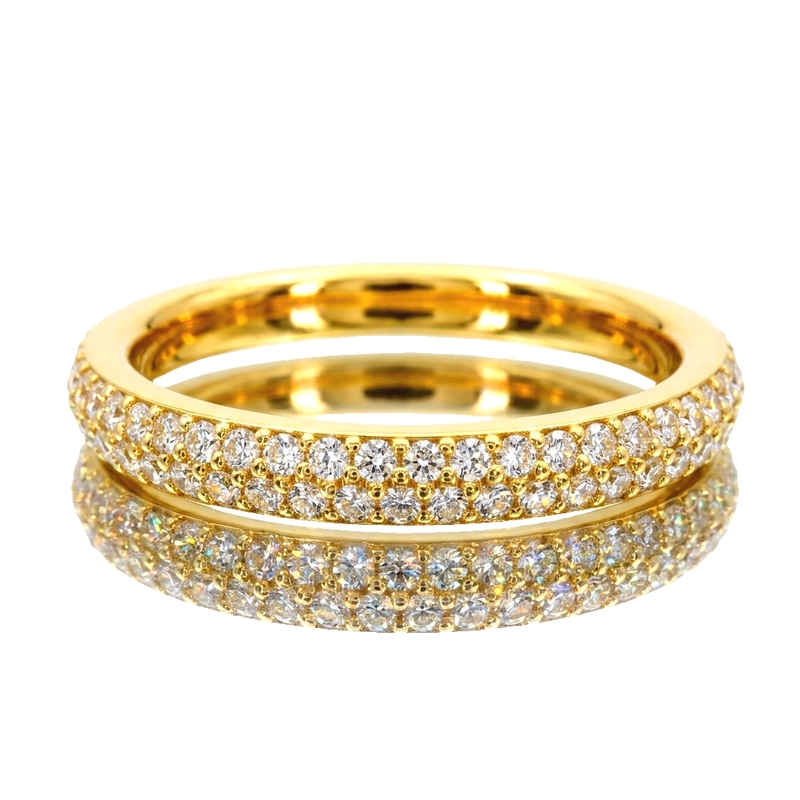 This beautiful eternity band shines with timeless elegance and sparkle. Crafted in rich 18K yellow gold, the ring features a continuous circle of brilliant-cut diamonds. These diamonds are carefully set close together in a pavé style, using tiny prongs. This creates the look of a solid band of dazzling light. Each diamond is chosen for its cut, clarity, and color. This ensures consistent and exceptional sparkle all around your finger. This eternity band symbolizes lasting love and commitment. It’s a perfect choice for a wedding band, anniversary gift, or to mark a special moment. The ring’s seamless design and continuous sparkle represent a strong and lasting bond.