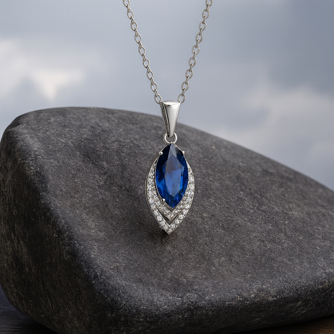 This stunning necklace is a true statement of classic elegance. It features a brilliant 1.12 carat natural blue sapphire, known for its rich and deep color. The sapphire is beautifully shaped in a striking marquise cut, framed by a halo of shimmering diamonds. The dazzling side diamonds with a total weight of 0.18 carats, are carefully set in an intricate bypass design. That enhances the sapphire’s brilliance. The pendant is crafted from elegant 18K white gold, which perfectly complements the cool tones of the blue sapphire and diamonds.