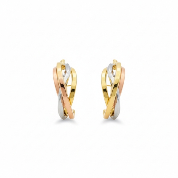 Elegant and iconic 18K gold hoop earrings featuring the distinctive three-interlocking-band design Trinity collection. Each earring showcases three intertwined bands of yellow gold, white gold, and rose gold, creating a harmonious and timeless aesthetic. These sophisticated earrings are a symbol of love, friendship and fidelity. The fluid, interlocking shapes add a touch of modern elegance to this timeless design, making them a versatile accessory for any occasion. The secure clasp ensures comfortable and confident wear.