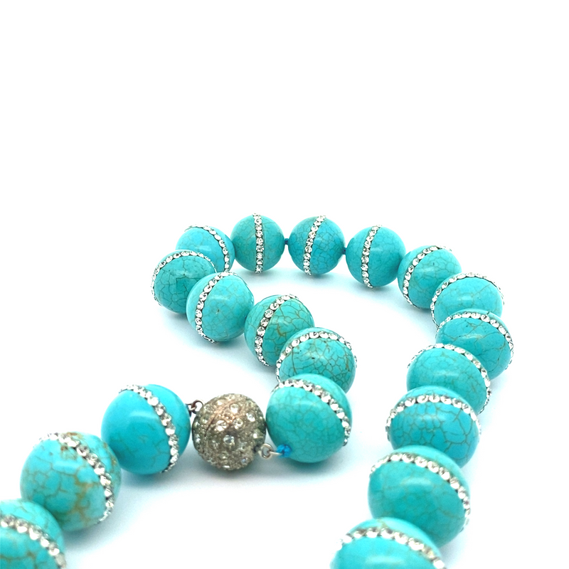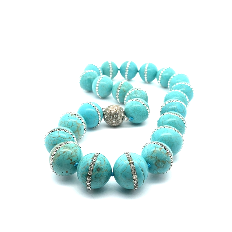 Introducing our exquisite semiprecious stone necklace, a true masterpiece that effortlessly combines the enchanting allure of Turquoise beads with the captivating sparkle of Swarovski elements.