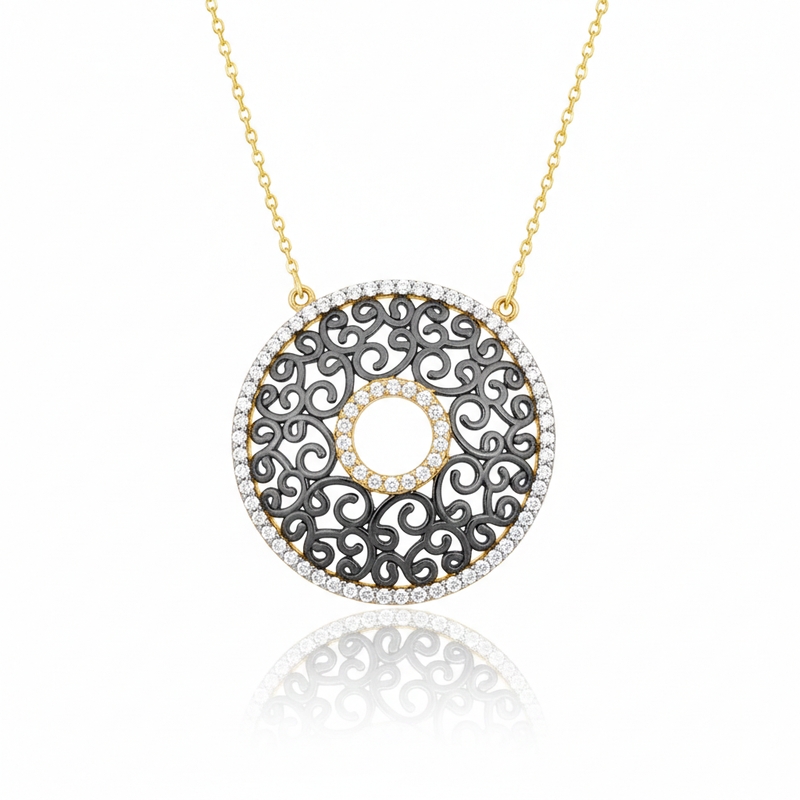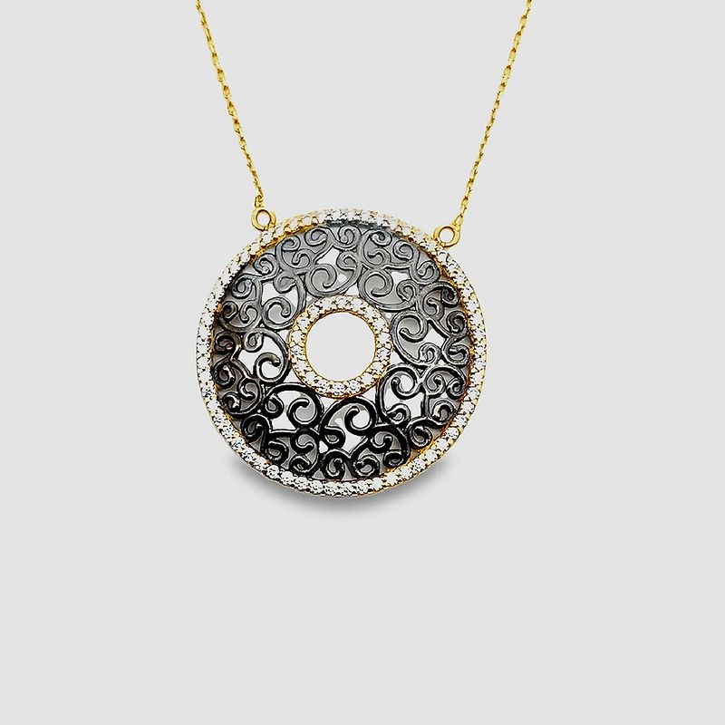 This dramatic necklace showcases a circular pendant crafted from 9K yellow gold. The design creates a striking two-tone contrast, where the central decorative element features intricate, scrolling filigree details finished with black rhodium plating. Clear, sparkling Cubic Zirconia (CZ) stones, set in a pave around the pendant’s round border and circular center cutout, brilliantly illuminate the dark filigree. The pendant hangs from a polished, delicate yellow gold chain, creating a bold, glamorous statement piece perfect for formal events or adding an edgy touch to everyday wear.