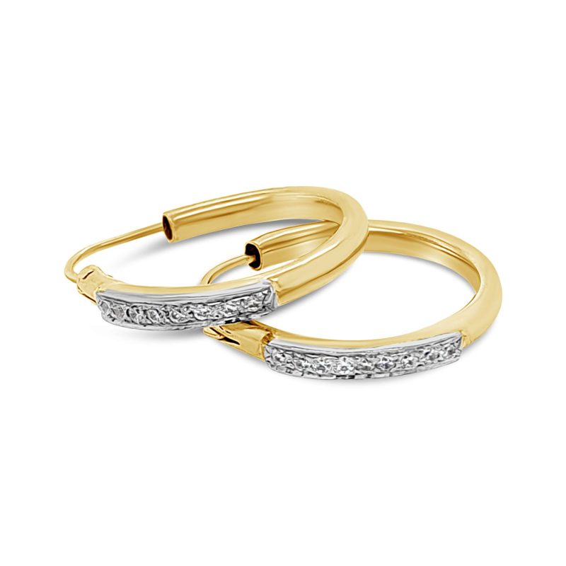 These are a chic and versatile pair of hoop earrings featuring a classic two-tone metal design. The main body of the hoop is crafted in highly polished 18 karat yellow gold. A distinct band across the bottom front is set in 18 karat white gold to create a subtle contrast. The white gold channel is set with a row of brilliant-cut accent cubic zirconia stones in a prong setting, adding a line of sparkle to the front-facing profile. The hoops are medium-sized and slightly wider, giving them a modern, classic look. The two-tone metal and strip of sparkle make them suitable for both everyday elegance and semi-formal wear.