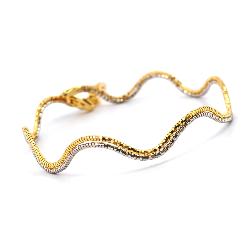 Discover the effortless elegance of our two-tone flexible 18K gold bangle bracelet, a piece designed for the modern woman. This stunning accessory features a unique wavy-like pattern that flows seamlessly around the entire circumference of the bangle, creating a sense of constant motion. Crafted from high-quality 18K gold, the contrasting yellow and white gold sections provide a sophisticated aesthetic that complements any jewelry collection.The flexible nature of this two-tone flexible 18K gold bangle bracelet ensures it is not only beautiful but also incredibly practical for daily wear. Because it is lightweight and easy to wear, it transitions perfectly from a day at the office to an elegant evening out. The textured, dynamic design catches the light from every angle, making it an eye-catching statement piece that remains subtle enough for everyday use.