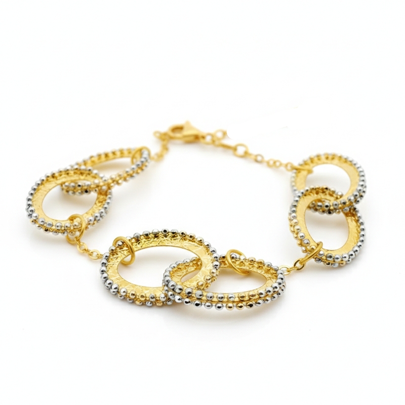 The sophisticated silver-toned portion sets this two-tone link 18K gold bracelet apart. It exhibits a delicate beaded surface. This detailing adds depth to the design. The mix of rich metal colors creates a unique appearance. This jewelry stands out in any collection. You can wear it for formal events. It also works for casual outings. This versatile piece makes a bold statement. You can also layer it with other favorite bracelets.