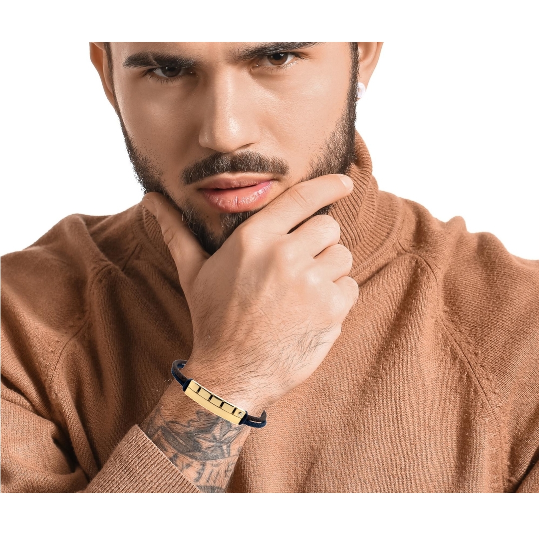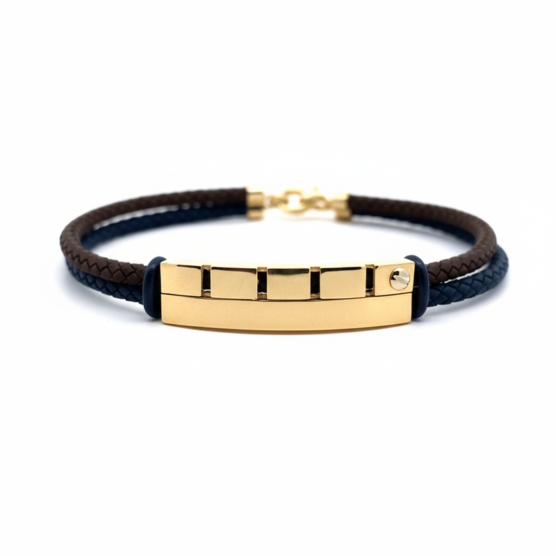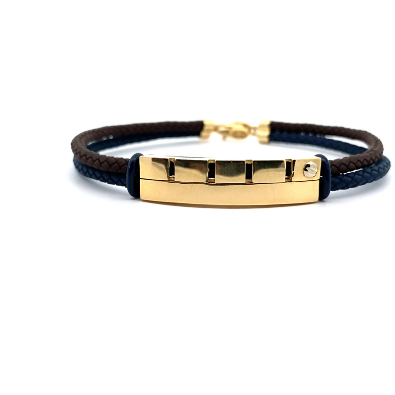 This is an 18-karat yellow gold and cord bracelet with a modern, mixed-material design. The bracelet features a centerpiece of polished 18K yellow gold in a rectangular plaque shape. The gold bar is segmented into several sections with recessed lines. It is subtly accented with a single, small cubic zircon set near the edge of the gold plaque. The band is composed of two strands of braided cord in contrasting dark colors, specifically dark brown and navy blue. The piece secures with a metal lobster clasp and is designed to be a versatile, contemporary accessory, suitable for both men and women.