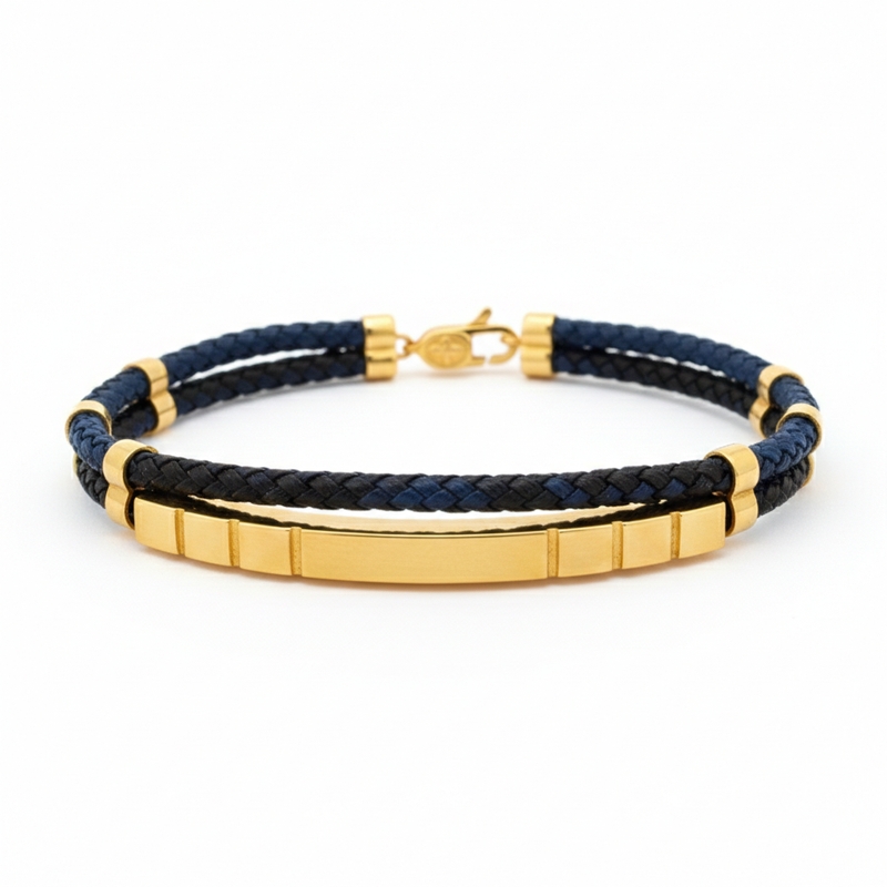 This contemporary bracelet offers a blend of luxury and casual style, making it a versatile accessory for men and women. The bracelet features 18-karat yellow gold combined with a durable braided cord in a two-tone color, navy blue and black. There is a central bar composed of uniform gold rectangular segments strung directly onto the cord. The bracelet is secured with a matching gold lobster clasp, perfectly balancing the casual texture of the cord with the richness of the fine metal.
