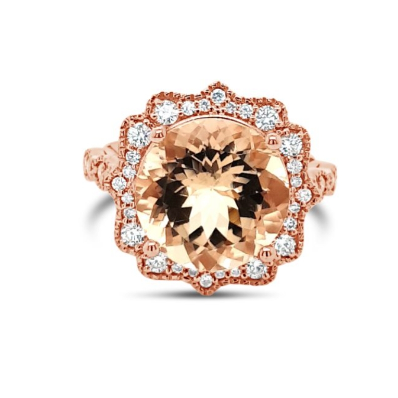 Experience the luxurious elegance of this stunning ring. It is meticulously crafted in warm 18-karat rose gold and showcases a magnificent design. The ring features a superb 4.72-carat natural Morganite. This large gemstone is cut into a sophisticated shape, with a desirable peachy-pink to champagne color. This beautiful hue pairs perfectly with the rosy tones of the gold. The center gem is framed by a glittering halo of natural Round Brilliant-Cut Diamonds. These accent diamonds have a total weight of 0.41 carats. With its substantial weight and superior diamond quality, this ring is a truly cherished and dramatic piece, perfect for any grand occasion.